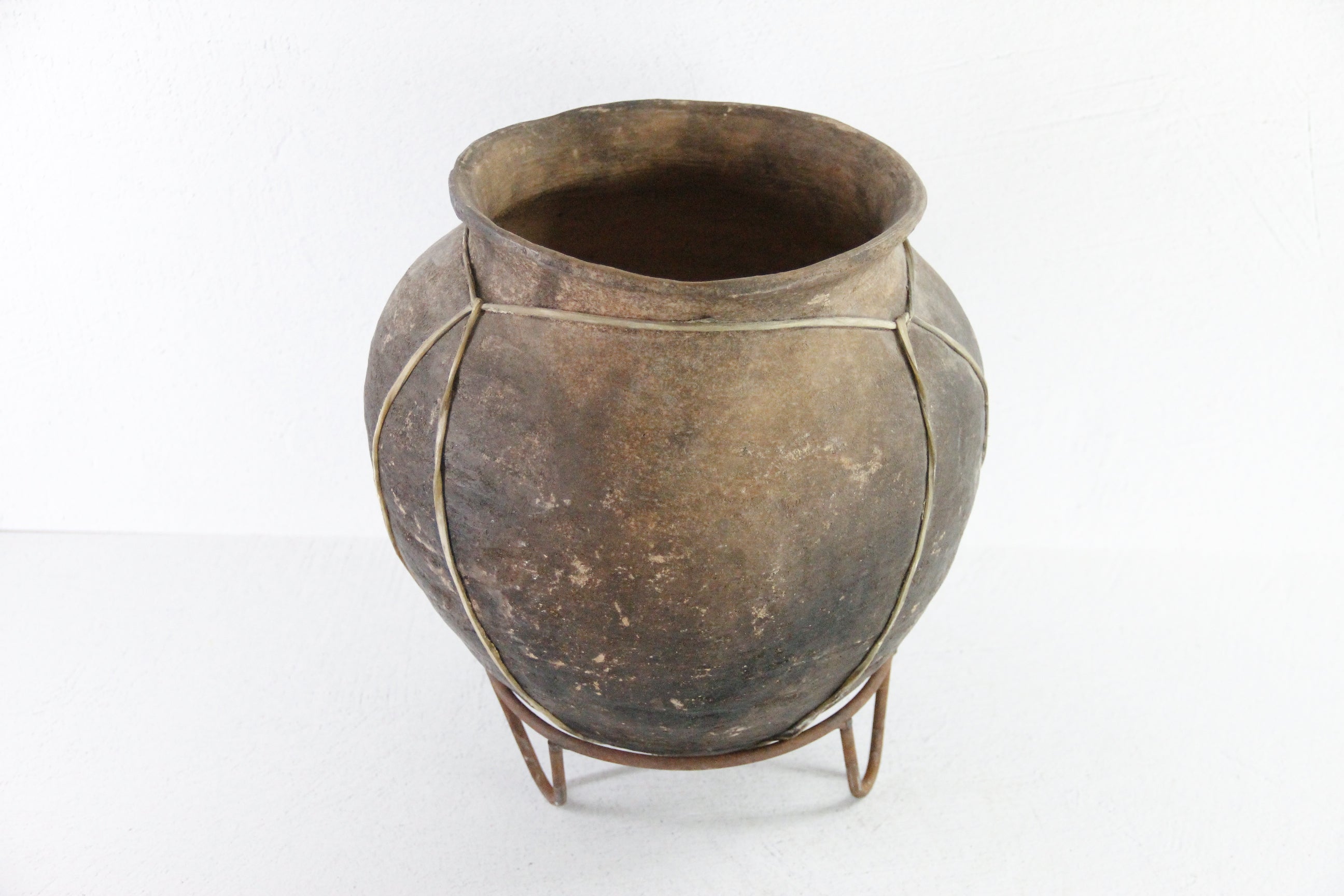 Tarahumara Indian Pottery Olla | Vintage Rawhide Bound Vessel on Stand