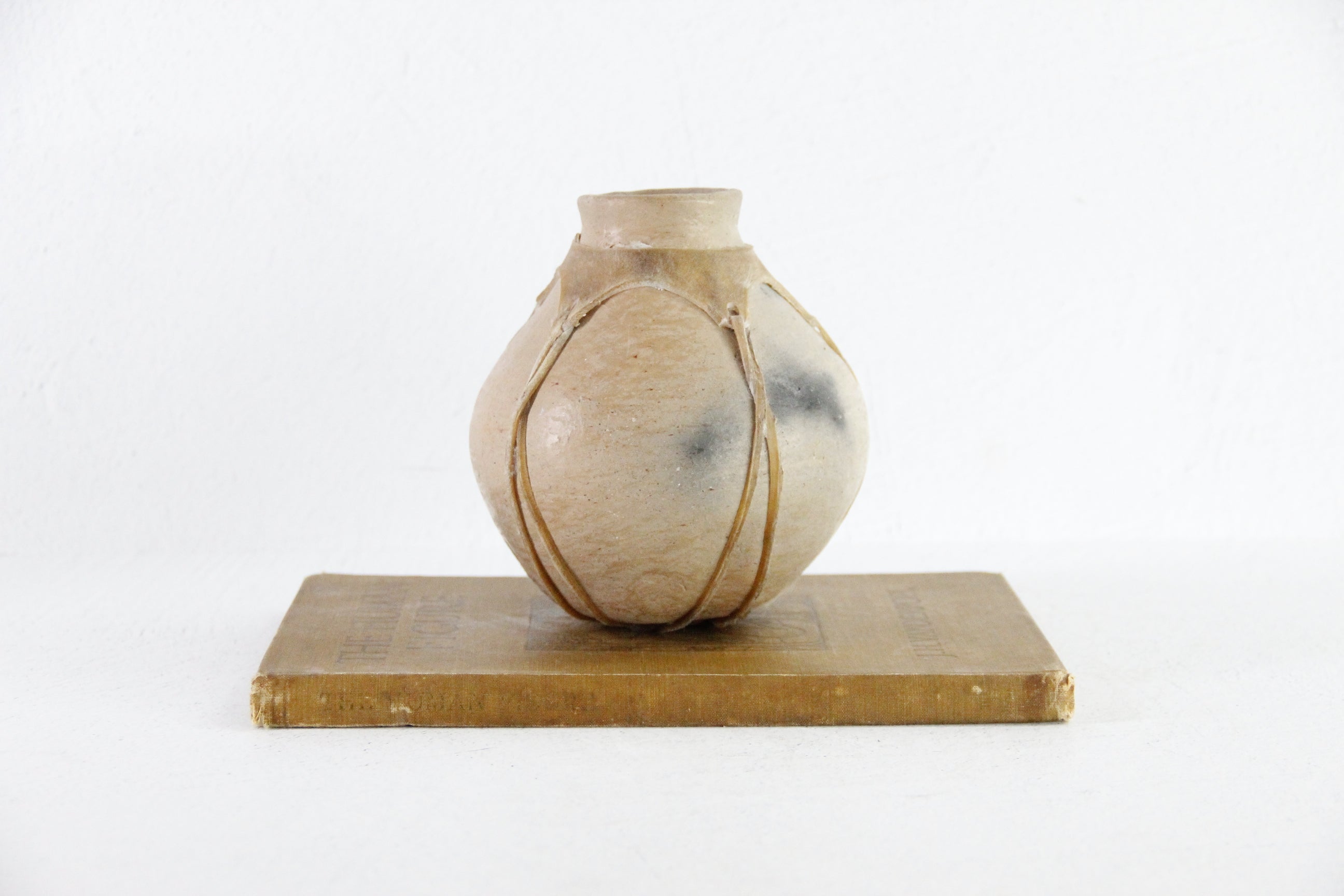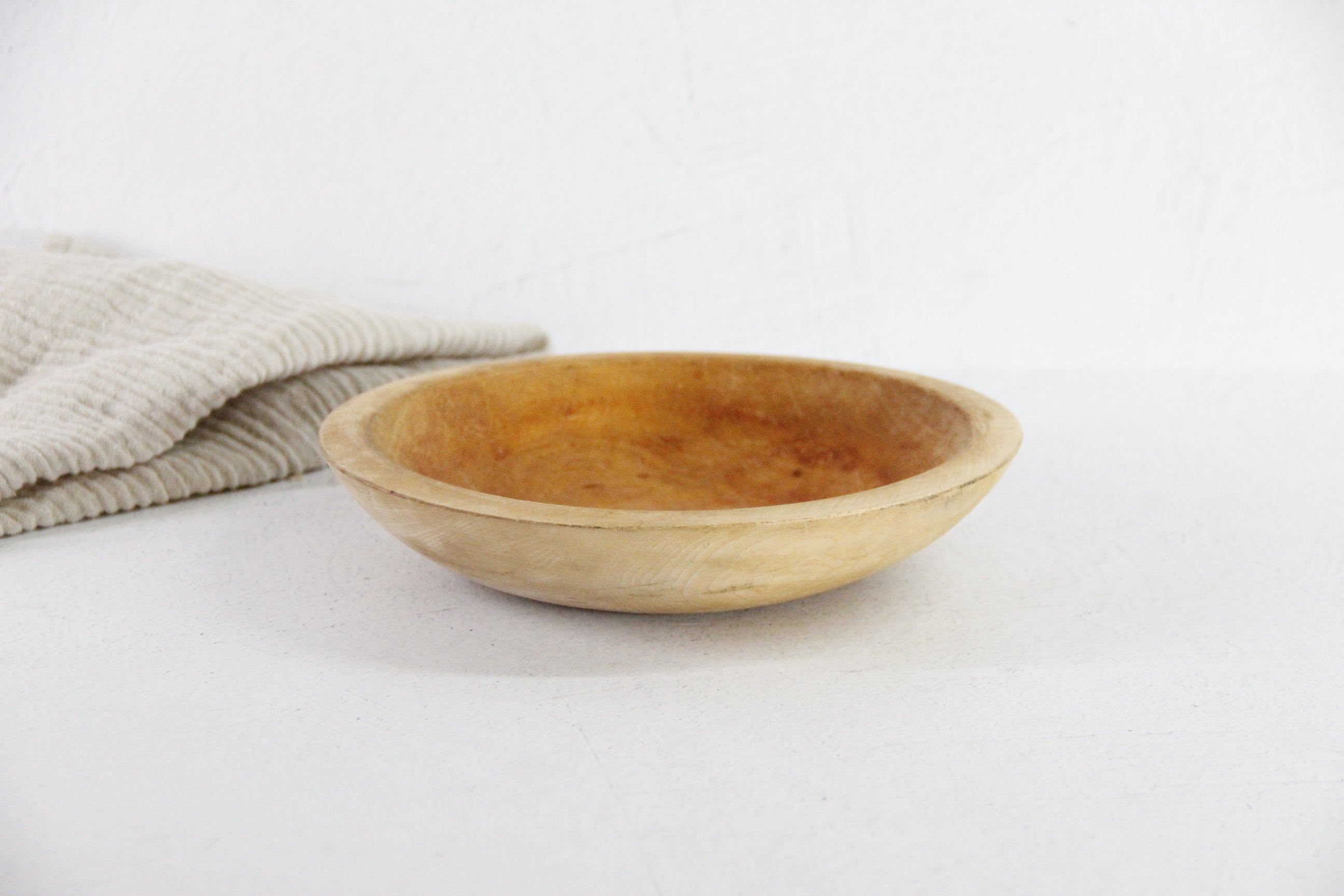 Collection of rustic kitchenware including bowls and a cutting board on a shelf.